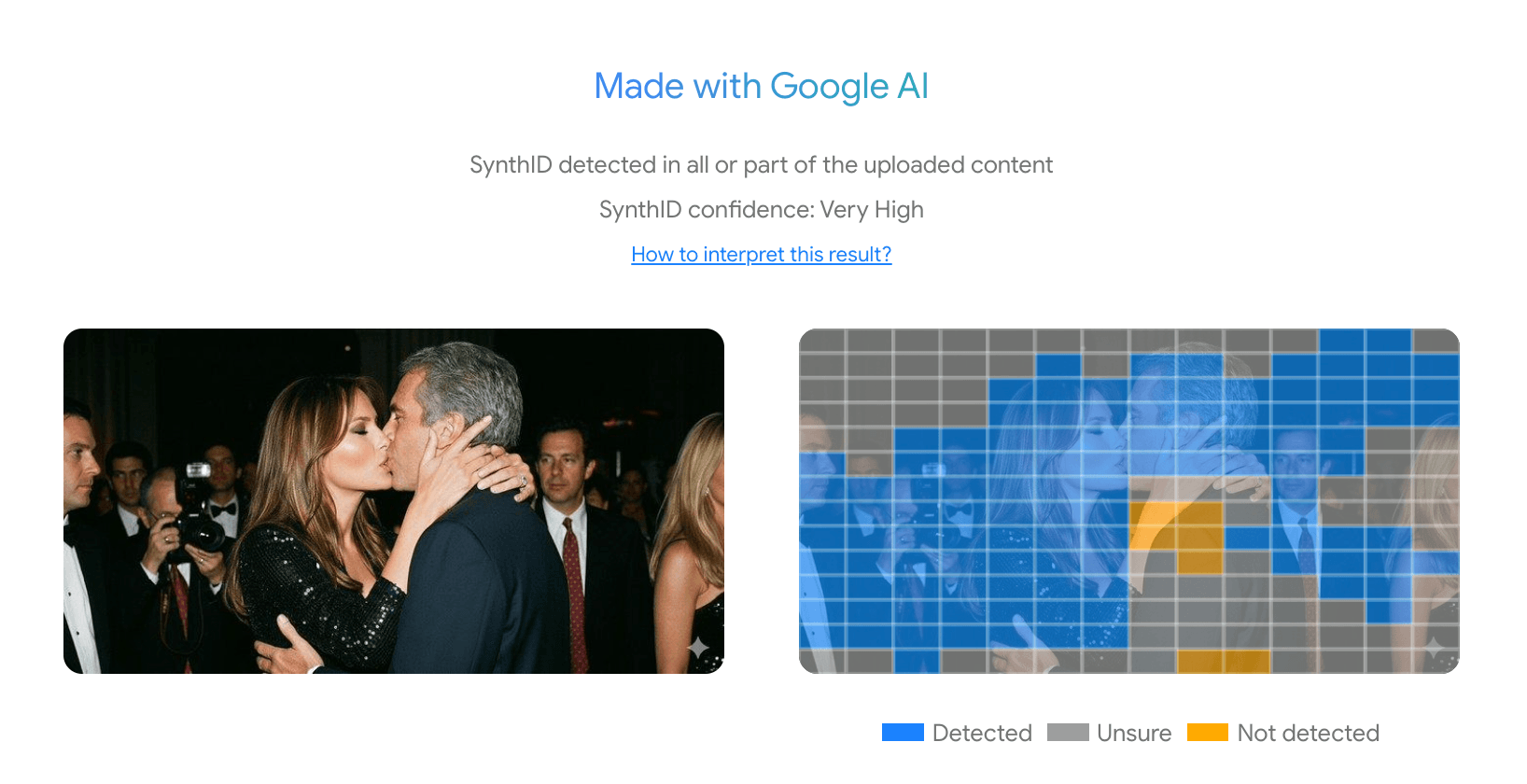 Un’analisi effettuata con SynthID Detector, strumento Google per identificare i contenuti IA, ha confermato che l’immagine in questione è stata creata artificialmente.