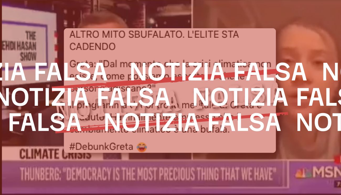 Il 22 giugno 2021 su Facebook è stato pubblicato un video che mostra uno spezzone di un’intervista realizzata dall’emittente statunitense Msnbc a Greta Thunberg, in cui l’attivista ambientale afferma: «Dal momento che la crisi climatica non esiste, come possiamo aspettarci che le persone agiscano?». La clip è accompagnata da questo commento, scritto da chi ha pubblicato il contenuto su Facebook: «Il programma di controllo mentale di Greta è scaduto. Ha finalmente ammesso che il cambiamento climatico è una bufala».