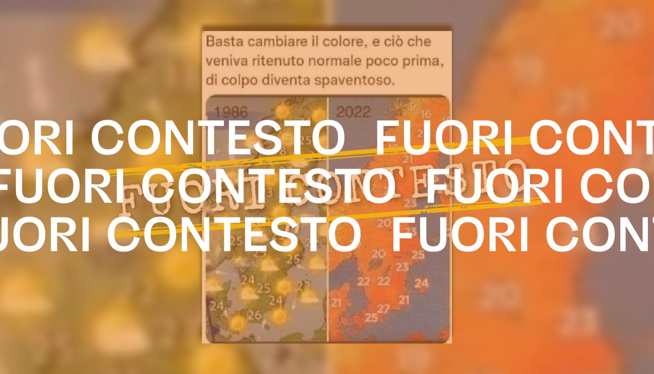 Il 2 agosto 2022 è stato pubblicato su Facebook un post che include due mappe relative alle previsioni del tempo in Svezia. L’immagine di sinistra è colorata in verde e include un testo che recita «1986», mentre quella di destra è sui toni del rosso e dell’arancione, che nello spettro cromatico sono comunemente associati a temperature più alte, e riporta la scritta «2022». La maggior parte delle aree contrassegnate sulla mappa di sinistra riportano una temperatura più elevata rispetto a alla mappa di destra.