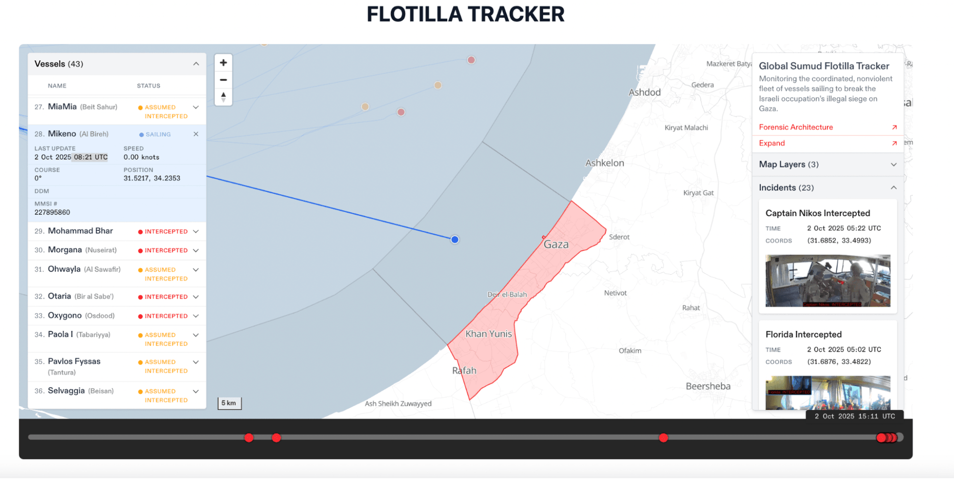 - La Mikeno, la mattina del 2 ottobre, è riuscita ad arrivare a pochi miglia dalle coste gazawi, ma poi si sono perse tracce sulla sua posizione, e non è chiaro se sia approdata a Gaza.