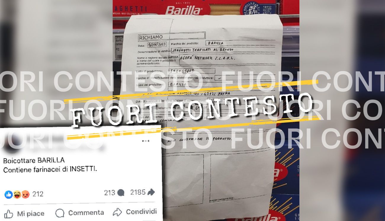 Il 14 gennaio 2023 la redazione di Facta ha ricevuto una segnalazione via WhatsApp che chiedeva di verificare un post pubblicato tre giorni prima su Facebook secondo cui bisognerebbe «Boicottare BARILLA» perché «Contiene farinacei di INSETTI». Nel post è presente anche la foto di un documento di richiamo, datato 16 novembre 2023, degli spaghetti trafilati al bronzo della Barilla, azienda italiana attiva nel settore alimentare. Il lotto «I14145863», si legge nel documento, sarebbe «contaminato da insetti».