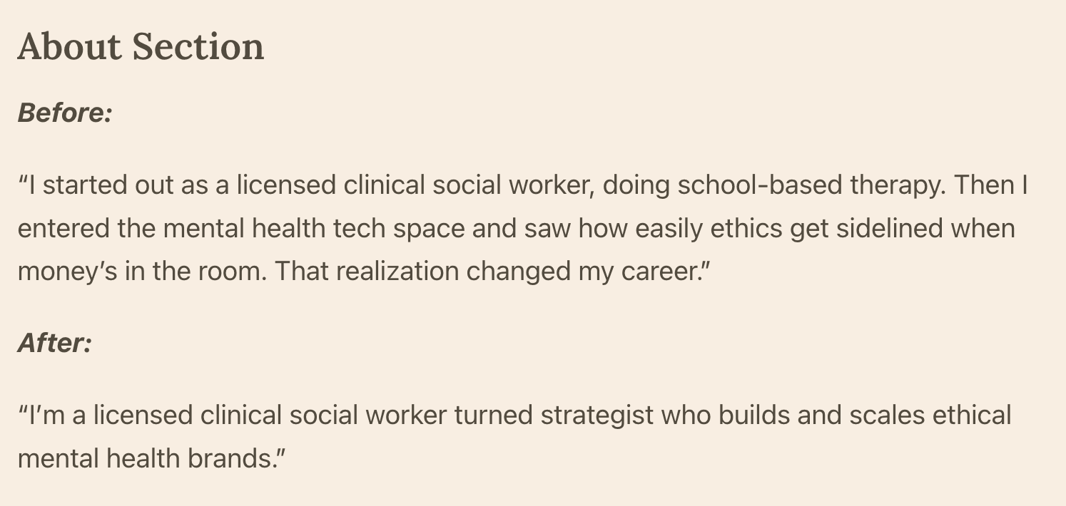 In particolare, Cornish ha cambiato il sommario (la breve descrizione professionale che appare sotto il nome) e la sezione “Informazioni” (lo spazio in cui, generalmente, si racconta la propria carriera professionale e percorsi di studio) formattandoli in uno stile e in un tono neutro, distaccato e assertivo, tipicamente associato a un linguaggio maschile. L’esperta di comunicazione aveva chiesto a un’intelligenza artificiale di riscrivere alcune frasi secondo un “Male Coded” (un codice machile). Ad esempio, la biografia iniziale di Cornish recitava: «Ho iniziato come assistente sociale clinica abilitata, occupandomi di terapia scolastica. Poi sono entrata nel settore della tecnologia occupandomi di salute mentale e ho visto con quanta facilità l’etica venga messa da parte quando ci sono di mezzo i soldi. Questa consapevolezza ha cambiato la mia carriera». Il nuovo testo, scritto sulla falsariga di un tono più diretto e considerato generalmente “maschile”, è invece più breve e coinciso: «Sono un assistente sociale clinico abilitato diventato stratega che crea sviluppa marchi etici nel campo della salute mentale».