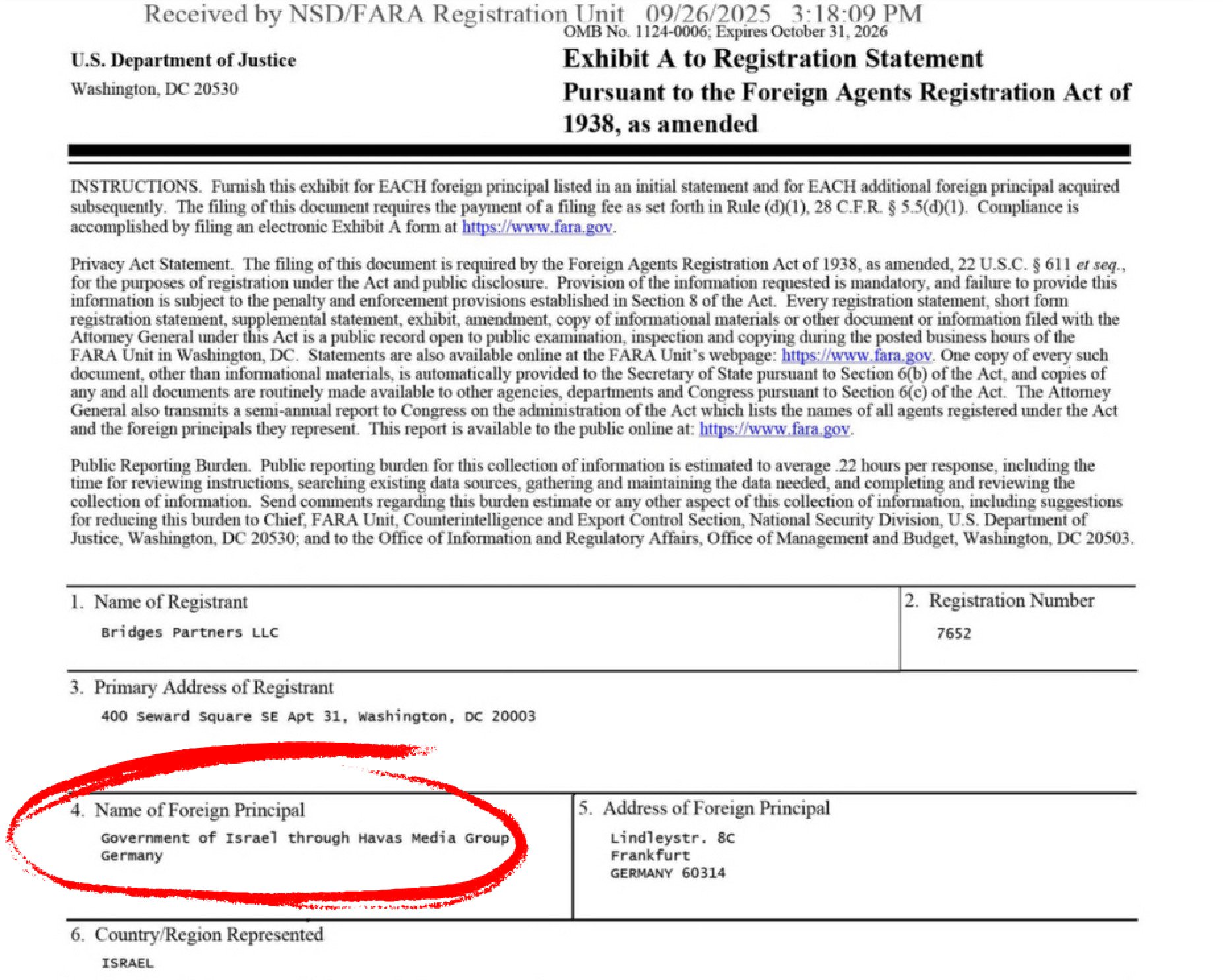 Nella comunicazione che questa società ha dovuto consegnare in conformità al Foreign Agents Registration Act (FARA) si legge che lo scopo è «contribuire a promuovere lo scambio culturale tra Stati Uniti e Israele» e che l’incarico è gestito da una divisione tedesca dell’agenzia di pubbliche relazioni globale Havas per conto del governo di Israele. Il FARA è una legge statunitense del 1938 che impone a individui o entità che agiscono nel Paese come “agenti” di committenti stranieri in veste politica di rivelare al DOJ i propri rapporti, attività e finanze.