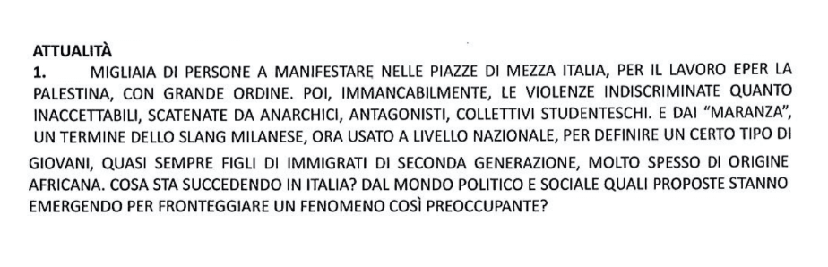 All’ultimo esame per diventare giornalista professionista, tenutosi a Roma il 28 ottobre 2025, una delle tracce proposte chiedeva di scrivere un articolo sul «fenomeno preoccupante» delle «violenze indiscriminate dei maranza» durante le manifestazioni a sostegno della Palestina del 3 ottobre 2025. La traccia non mancava di associare questo «tipo di giovani» alla violenza e di sottolinearne la loro componente etnica: «figli di immigrati […] molto spesso di origine africana».