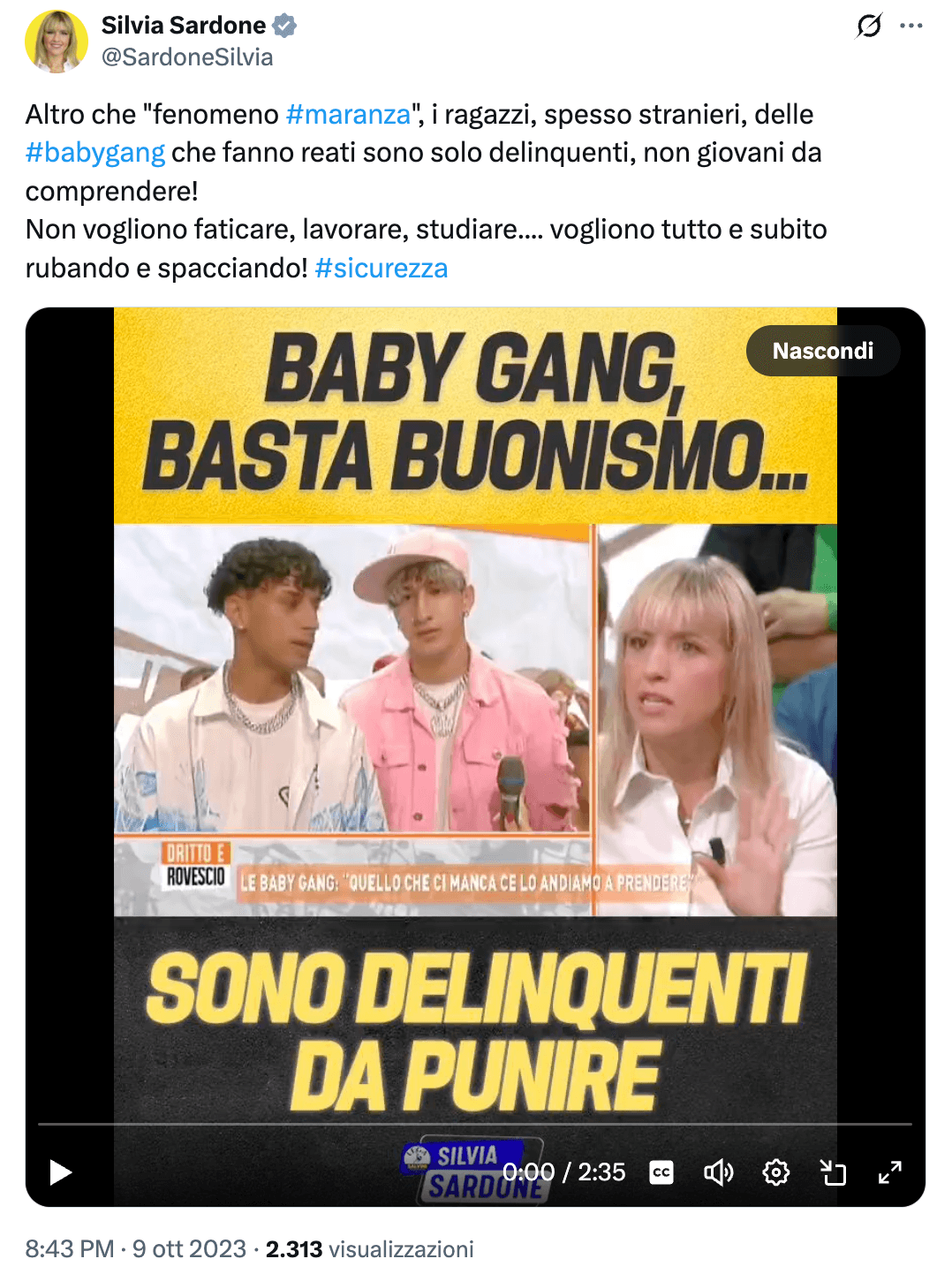 L’uso del termine diventa virale: la ricerca su Google della parola “maranza” impenna e alcuni esponenti politici iniziano a parlarne in relazione alla presunta emergenza delle “baby gang”, legando al termine anche una connotazione securitaria. Tra questi sicuramente Silvia Sardone, europarlamentare della Lega che negli ultimi anni ha fatto della retorica su “maranza” e “baby gang” uno dei suoi punti forti sui suoi account social media. In realtà, sulle cosiddette “baby gang” paventate come una minaccia alla sicurezza circolano da tempo luoghi comuni e falsi miti che hanno alimentato una narrazione infondata secondo cui sarebbero un’emergenza nazionale. Come rivela un rapporto di Transcrime del 2022, la criminalità giovanile in Italia è in diminuzione, e la presunta connotazione etnica di questi gruppi di giovani, che viene così spesso data per scontata, è smentita dal fatto che nelle “gang giovanili” ci sono anche italiani.