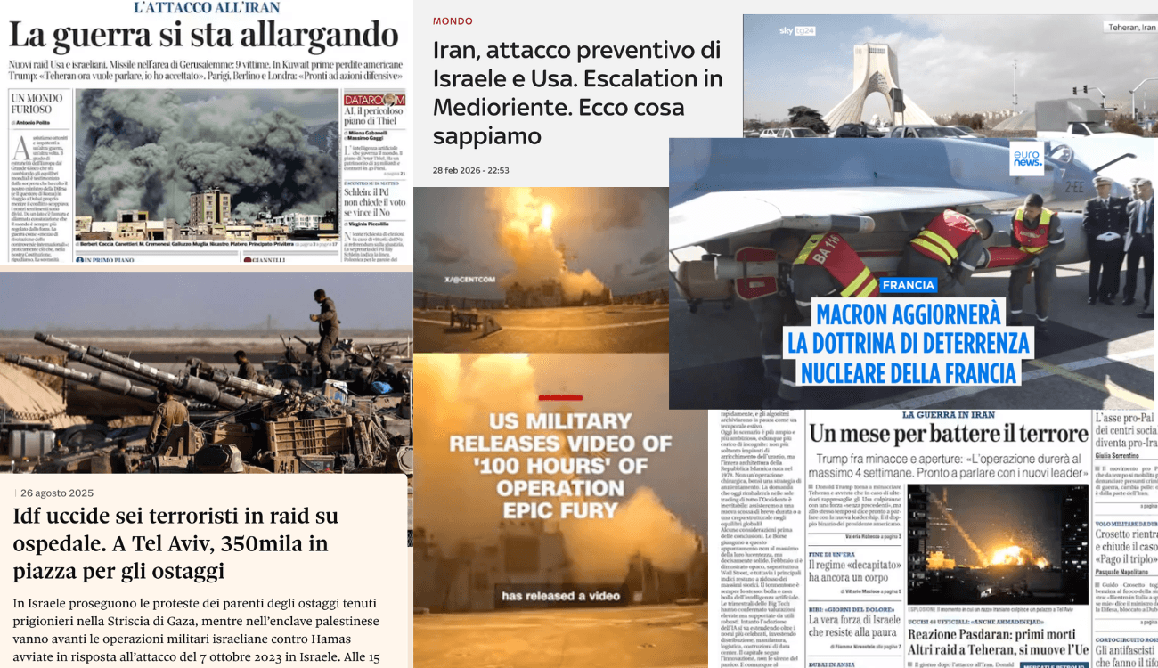 Per capire come funziona questo meccanismo basta guardare le prime pagine dei giornali. Due giorni dopo l’inizio del conflitto in Iran, il 28 febbraio 2026, tre quotidiani italiani raccontano lo stesso scenario internazionale in modi molto diversi: Domani titola: “I signori della guerra”; il Giornale sceglie: “Un mese per battere il terrore” e il Fatto Quotidiano scrive: “Trump e Bibi non hanno avvertito Italia e UK dei raid”.
