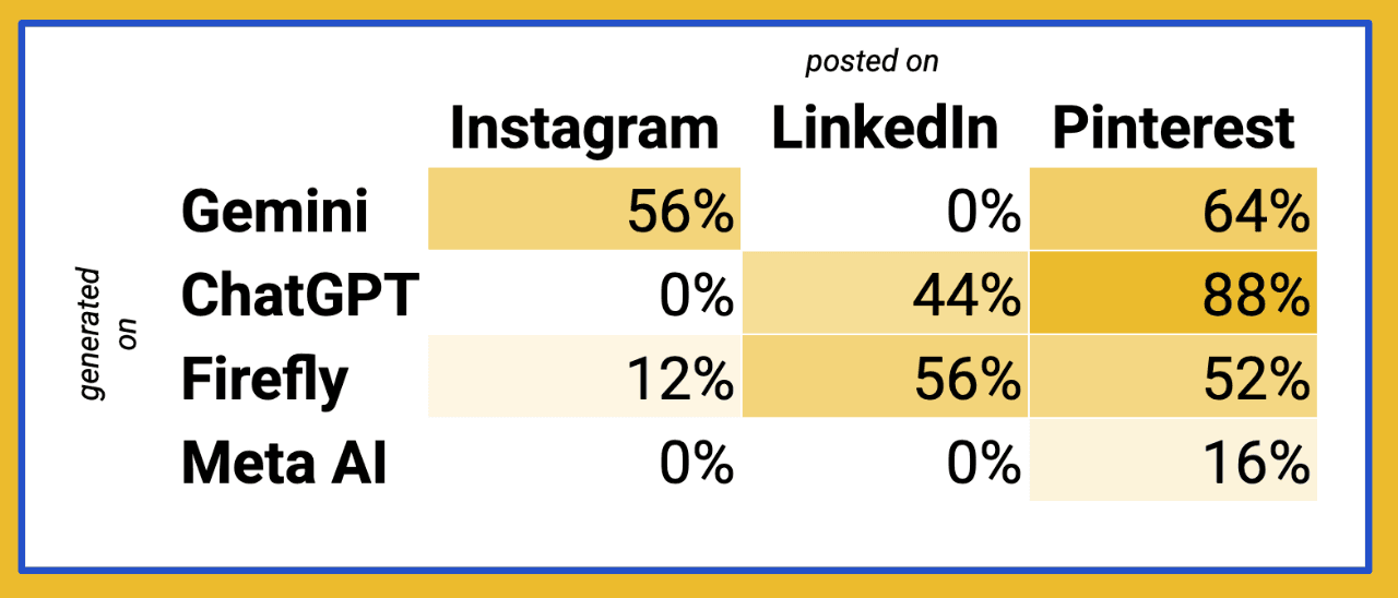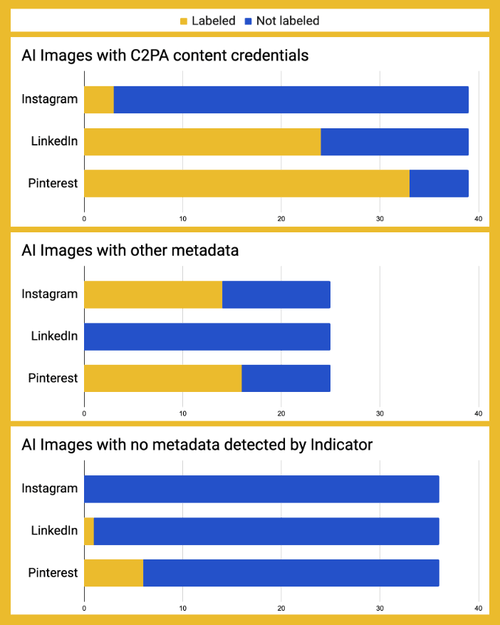 Pinterest è stato il migliore nell’etichettare le immagini generate con IA, avendo etichettato correttamente 55 dei 100 post aggiunti. LinkedIn ne ha rilevati 25 e Instagram 17.