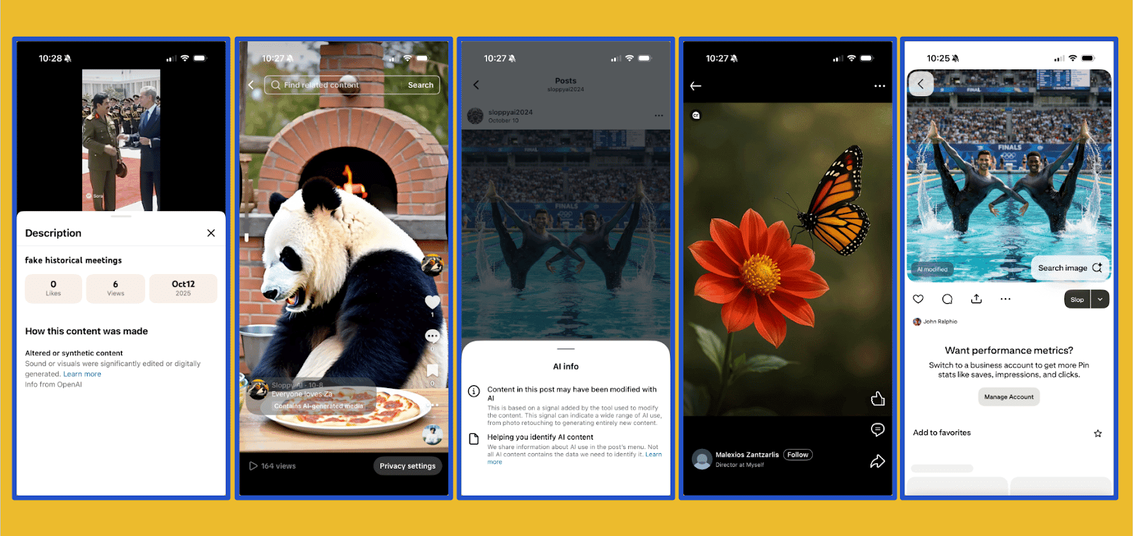 Molte delle più grandi piattaforme social hanno dichiarato che applicheranno etichette ai contenuti generati con l’IA, anche se, come documentato dalla guida alle etichettatura di contenuti IA pubblicata su Indicator, le implementazioni variano. Instagram «potrebbe» identificare ed etichettare «i contenuti con segnali che possono essere identificati come creati con l’IA», inclusi «tutti i contenuti creati o modificati utilizzando gli strumenti di IA di Meta e condivisi su Facebook, Instagram o Threads». LinkedIn ha annunciato un anno fa che avrebbe «adottato lo standard C2PA».Pinterest afferma che «non solo analizziamo i metadati di un’immagine seguendo lo standard IPTC Metadata Standard, ma abbiamo anche sviluppato classificatori che rilevano automaticamente i contenuti Gen AI, anche se questi non presentano filigrane evidenti». TikTok «potrebbe applicare automaticamente l’etichetta “generato con l’IA” ai contenuti che identifichiamo come completamente generati o significativamente modificati con l’IA. Ciò può accadere quando un content creator […] carica contenuti generati con l’IA a cui sono allegate Content Credentials (credenziali di contenuto, ndr)». YouTube «riporterà le informazioni fornite dagli strumenti e dai content creator disponibili con credenziali di contenuto sicure (Content Credentials C2PA 2.1 o versioni successive) che indicano che l’intero video è stato realizzato con l’IA».