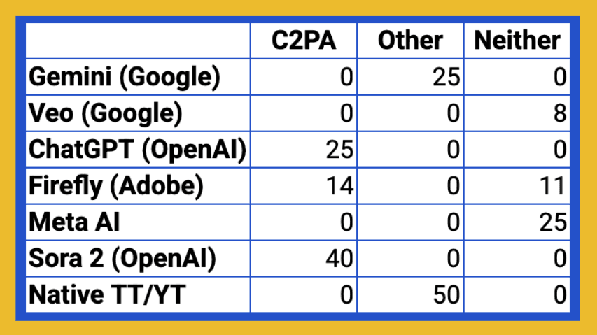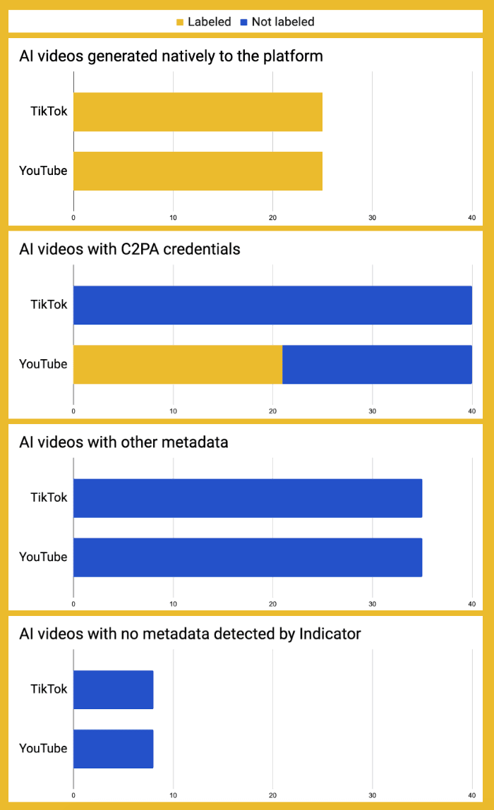 Tra le piattaforme video, YouTube ha ottenuto risultati nettamente migliori rispetto a TikTok; su quest’ultima piattaforma, infatti, non è stato etichettato nemmeno un video generato con IA che non fosse stato creato utilizzando il software IA interno a TikTok stessa. Ad esempio, YouTube ha correttamente etichettato la maggior parte dei nostri video generati con Sora 2, mentre TikTok non ha etichettato alcun contenuto di questo tipo.