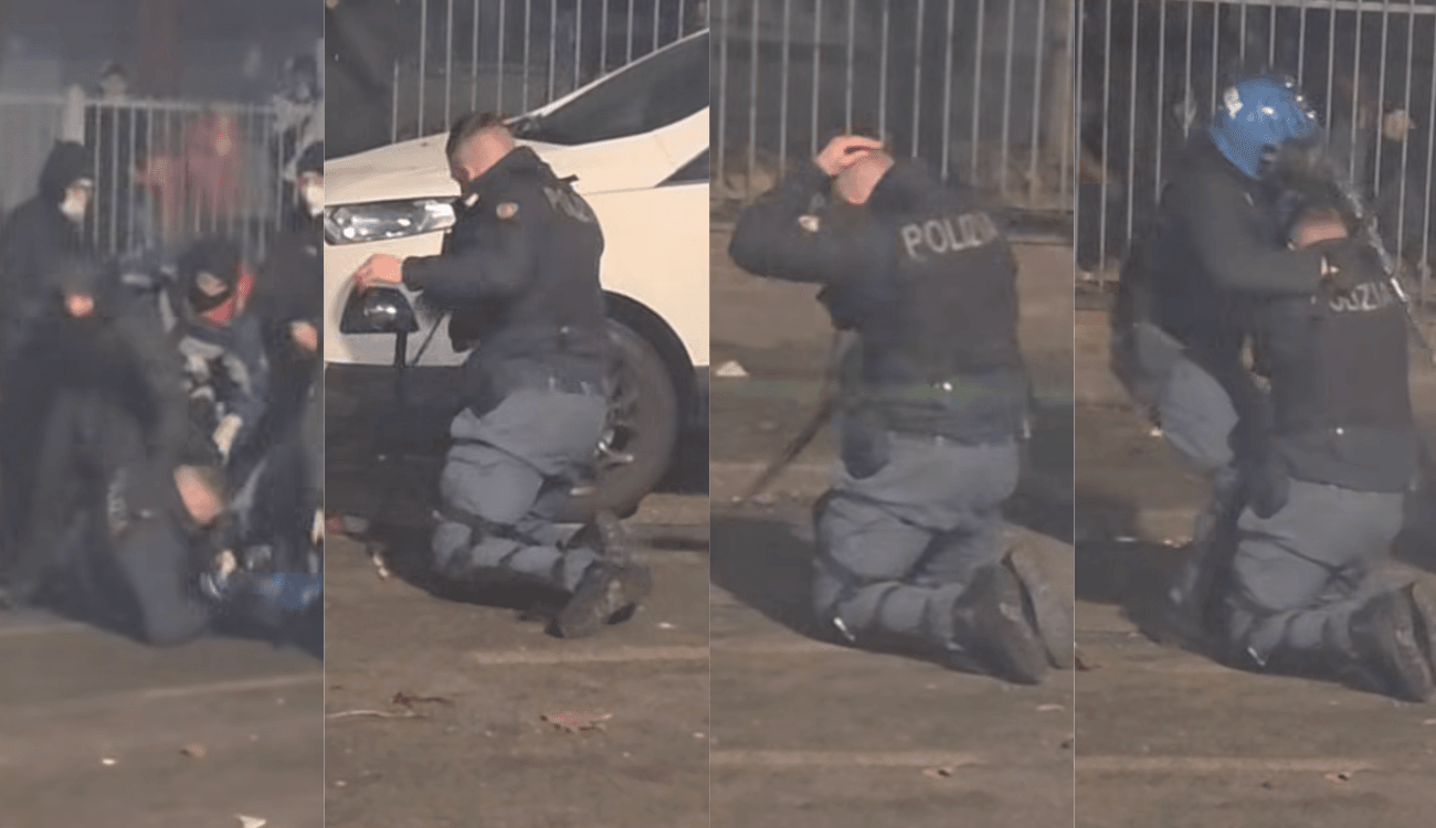 Online sono circolati svariati video degli scontri. Un filmato in particolare è diventato virale. La clip mostra un poliziotto da solo a terra, senza casco e maschera antigas, violentemente picchiato da un gruppetto di persone incappucciate con pugni e calci, anche in testa, e preso a martellate su una gamba e sulla schiena. Si vedono poi gli aggressori indietreggiare e un altro poliziotto arrivare in aiuto del collega. Quest’ultimo compare nel video con indosso casco, maschera antigas e scudo, utilizzato per coprire entrambi dagli oggetti lanciati dai manifestanti.
