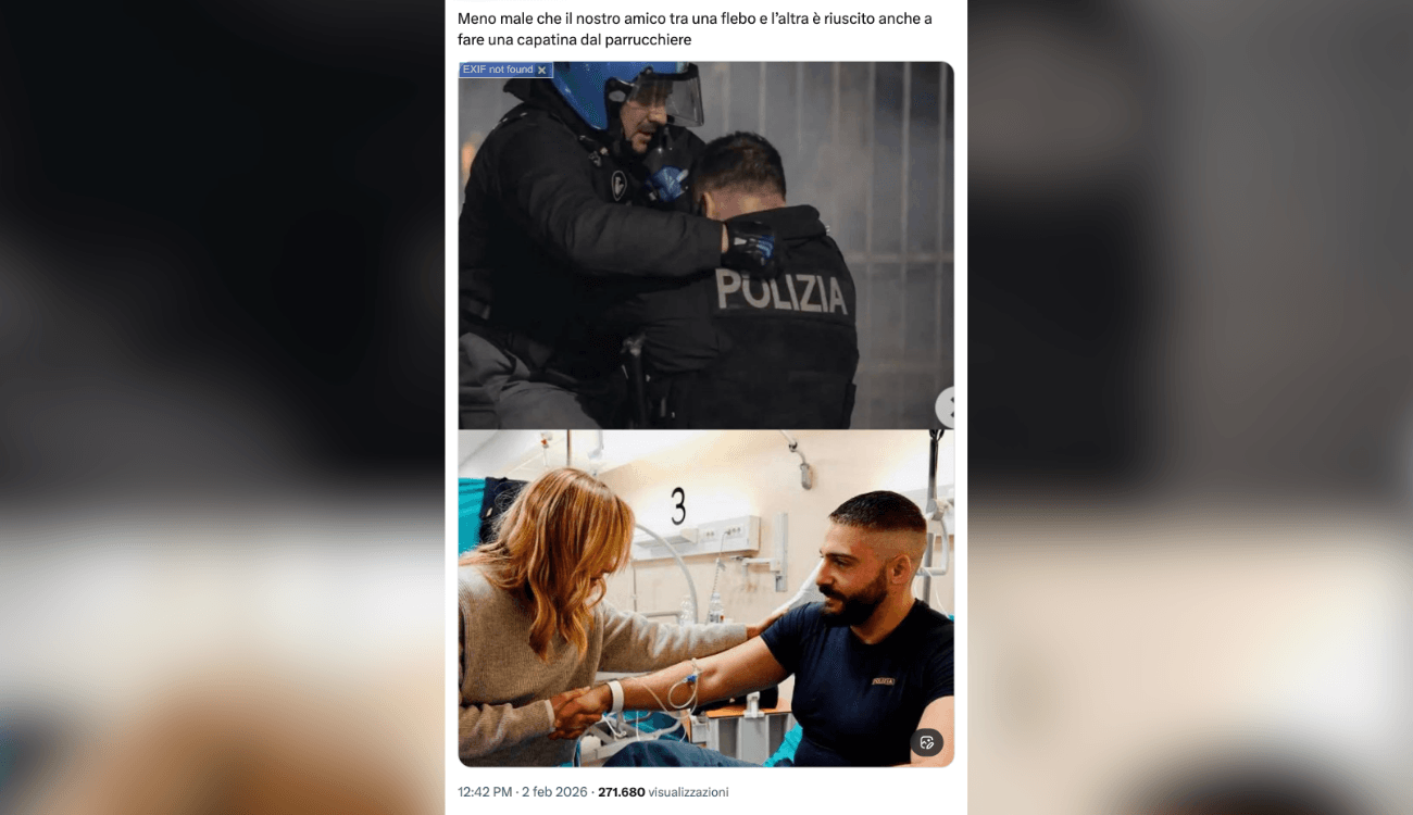 Inoltre, diversi elementi presenti della foto non corrispondono alla scena reale immortalata nel video di Torino Oggi. Nello scatto diffuso dalla Polizia, Virgulti appare senza maschera antigas, con i baffi e senza scudo. Nella realtà, invece, l’agente accorso in aiuto del collega aveva indosso la maschera antigas e lo scudo. Il poliziotto, inoltre, porta la barba e non i baffi, come si può vedere in un video diffuso dalla Polizia il 2 febbraio 2026.