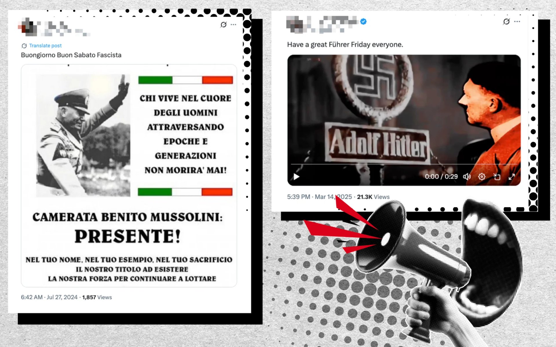 The content listed so far has been shared almost exclusively on X, which, as noted, does not enforce particularly strict moderation of neo-fascist, neo-Nazi, or antisemitic content. Such a strategy would be hard to detect through moderation, since in most cases these are images without text functioning as dog whistles (in coded messages that reinforce a sense of belonging to an extremist community). On the few occasions when the mattonisti community uses text posts, it employs a form of dissimulation that consists of replacing key words with others that are hard to detect: Adolf Hitler thus becomes the “Austrian painter,” Benito Mussolini “big jaw,” and the Holocaust the “lollocaustro.”