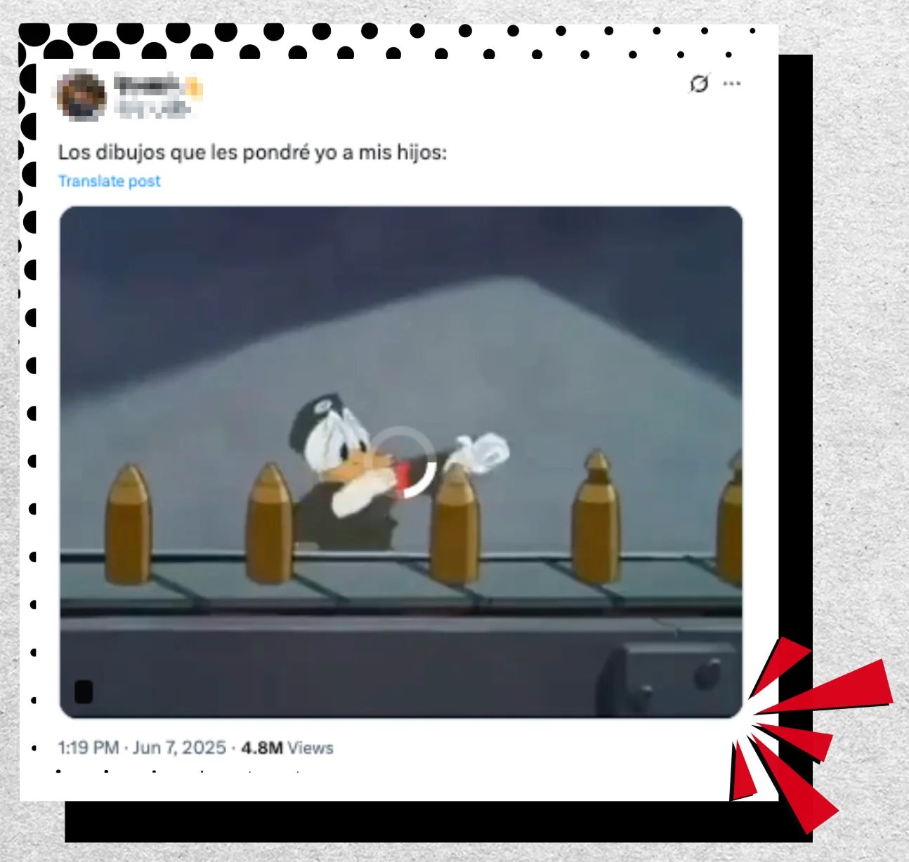 There are other examples of cartoons that were originally used as propaganda against the Nazi or fascist movement but are now being shared in fragments on social media with messages of support for these movements. This has also happened with The Ducktators (1942), a Warner Bros production released as part of a series of propaganda shorts broadcast during World War II, featuring a duck with a mustache (which is actually a caricature of Adolf Hitler), another bald duck with an Italian accent (representing Benito Mussolini), and a duck with glasses and a squeaky voice (a parody of Hideki Tōjō, a Japanese military officer who served as prime minister during World War II). The three form a dictatorship on the farm, where they simulate military marches, give fascist salutes, and deliver speeches. Images of these moments circulate on platforms such as X, Facebook, and TikTok.