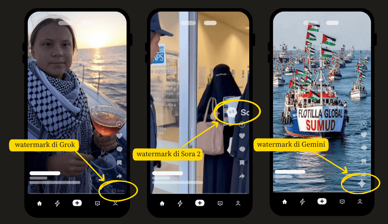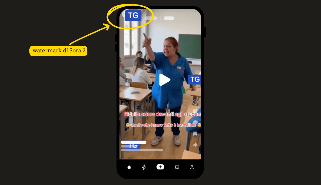 I video generati con Sora 2 hanno un watermark visibile, ovvero una filigrana che si muove sullo schermo in tre punti specifici: in alto e in basso a sinistra, e poi a metà altezza a destra. Nel caso di Sora, si tratta di una piccola nuvoletta animata con gli occhi e la scritta “Sora”. Anche altri modelli di IA inseriscono i propri watermark sul contenuto generato artificialmente: ad esempio, il modello di X Grok tende a mostrare in basso a destra la scritta “Grok” con il logo di un cerchio attraversato da una linea, mentre l’IA di Google, Gemini, mostra il proprio watermark in basso a destra, una stella a quattro punte.