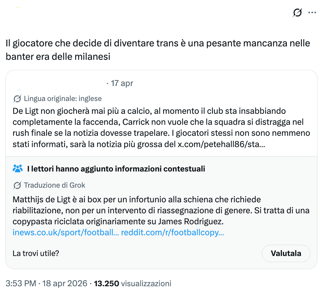 In altri casi, l’ironia esaspera le barriere linguistiche, e notizie false pubblicate con intento satirico vengono prese per vere al di fuori del loro contesto linguistico originario. Ad esempio, a metà aprile 2026 è circolata in inglese la notizia che il calciatore del Manchester United Matthijs de Ligt non avrebbe mai più giocato a calcio per via di un intervento di riassegnazione di genere. In realtà, de Ligt è temporaneamente impossibilitato a giocare per via di un infortunio alla schiena per il quale ha avviato un percorso di riabilitazione. Nonostante il post fosse stato inizialmente pubblicato in inglese in senso ironico per prendere in giro il calciatore con un insulto transfobico, in italiano alcuni utenti hanno preso la notizia per vera, creando un vero e proprio caso di disinformazione.