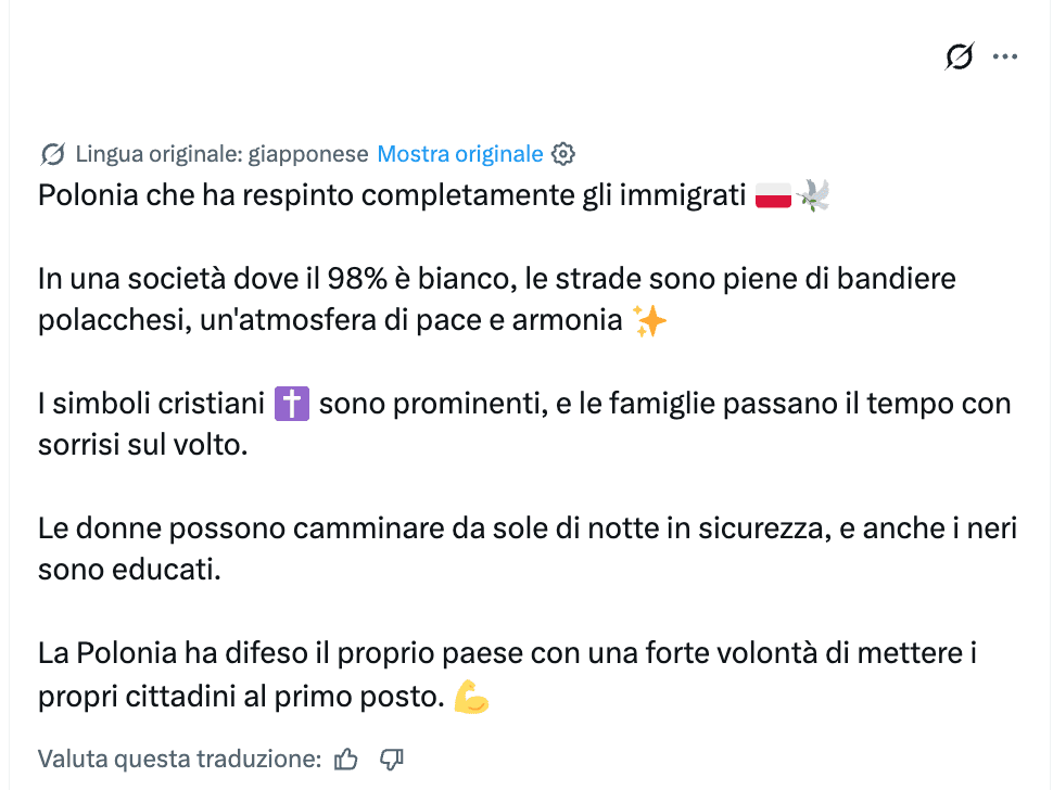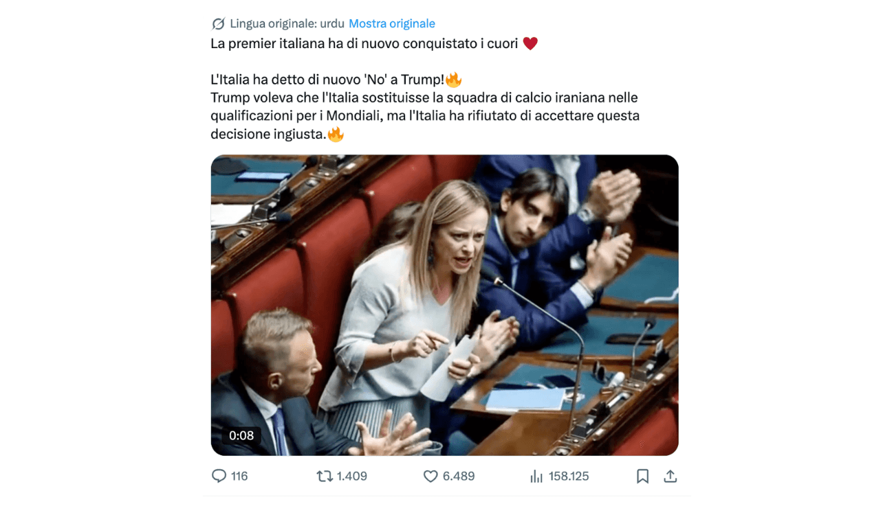 Ad esempio, il 21 aprile è stato pubblicato in giapponese un post di propaganda anti-immigrazione sulla Polonia, poi commentato lo stesso giorno in polacco da vari utenti. Il 24 aprile, invece, è circolato un post originariamente pubblicato in urdu, lingua ufficiale del Pakistan, che punta a dipingere Meloni come un’icona anti-USA, un filone di disinformazione internazionale che, come abbiamo analizzato su Facta, esagera o inventa dichiarazioni della presidente del Consiglio italiano. Il post è stato poi commentato da utenti in italiano e in inglese. Uno scambio che non sarebbe stato così facile se non fosse stato per la traduzione automatica.