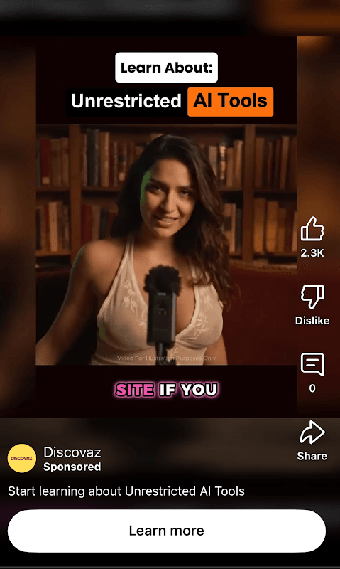 Tra luglio e agosto 2025, tra gli shorts di YouTube, hanno iniziato a circolare alcuni reel pubblicitari generati con l’intelligenza artificiale che sponsorizzavano un sito chiamato Discovaz.com. Gli ads che sponsorizzano questo sito mostrano di solito una donna in abiti succinti che invita l’utente, con voce ammiccante, a scoprire come usare tool IA senza restrizioni; suggerendo in tal modo l’utilizzo di IA generativa per contenuti pornografici.