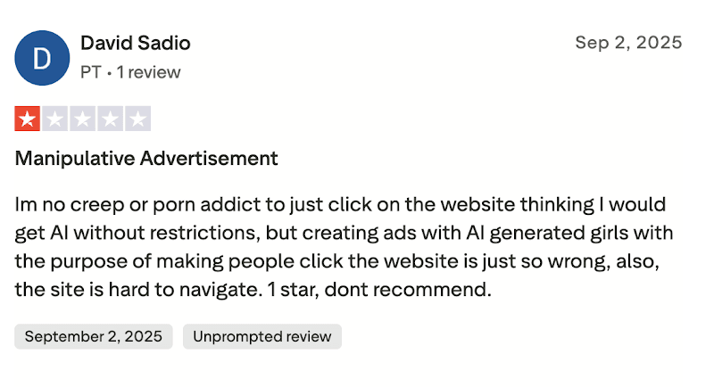 Inoltre, da agosto 2025 su Trustpilot – una piattaforma che raccoglie recensioni e opinioni dei consumatori su aziende e servizi – sono comparse le prime recensioni su Discovaz lasciate da utenti online. La quasi totalità di queste recensioni accusa il sito di fare advertising manipolatorio, e alcune citano come esempio proprio il tipo di ads pornografico che abbiamo esaminato.