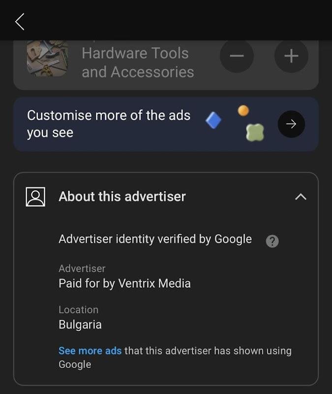 È interessante notare che il reel in questione non è stato messo in circolazione su YouTube direttamente da Discovaz.com. Se infatti si aprono i dettagli dell’annuncio (su smartphone lo si può fare selezionando i tre punti in alto a destra dell’annuncio), si scopre che l’advertiser è un certo Ventrix Media: un’agenzia pubblicitaria con sede in Bulgaria.